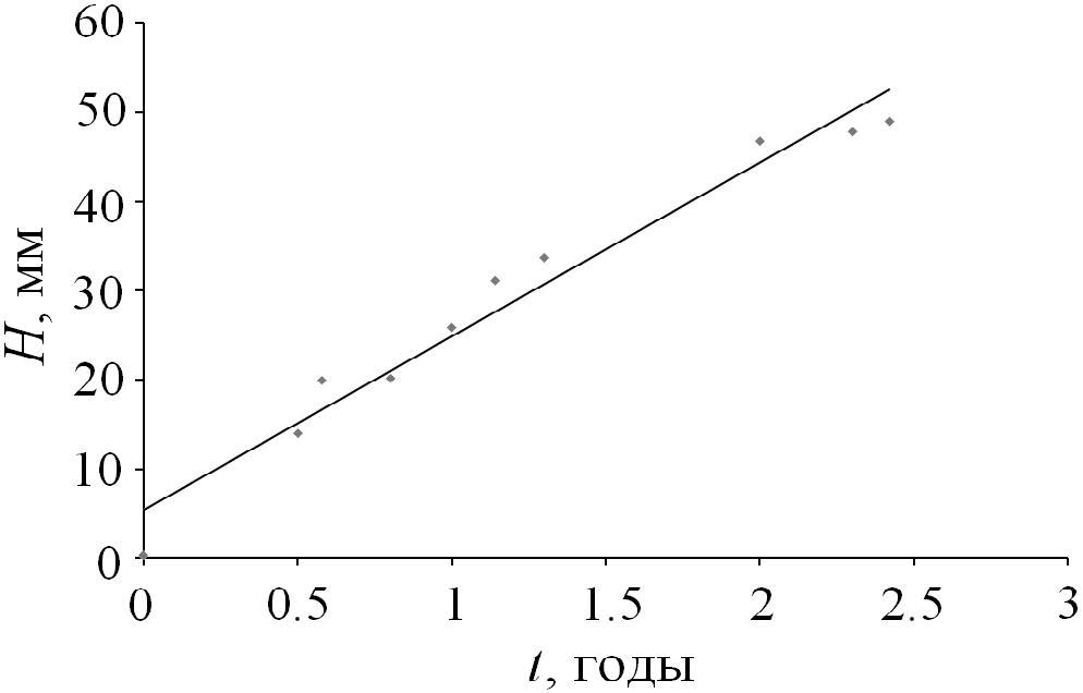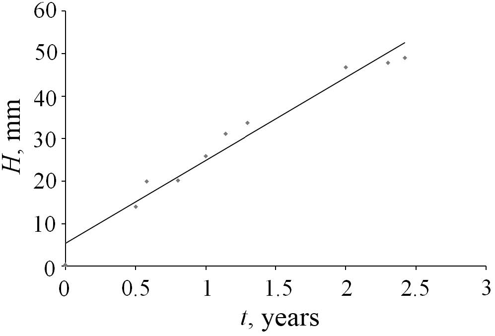 t, years | kt | e−kt | 1 − e−kt | Ht (theoretically expected), mm | H ± i (actual), mm |