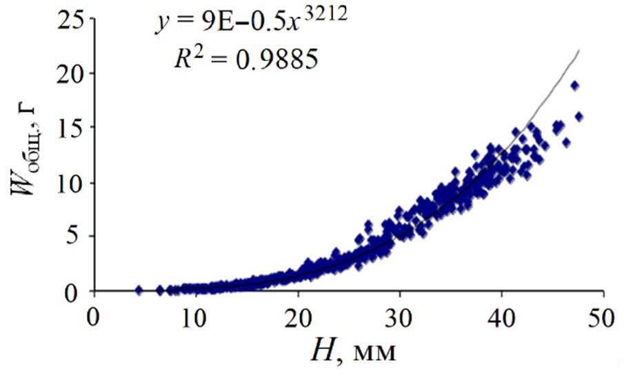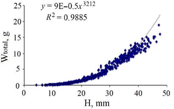 Fig. 3. Dependence of the total weight of the scallop Flexopecten glaber ponticus on the shell height