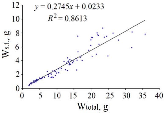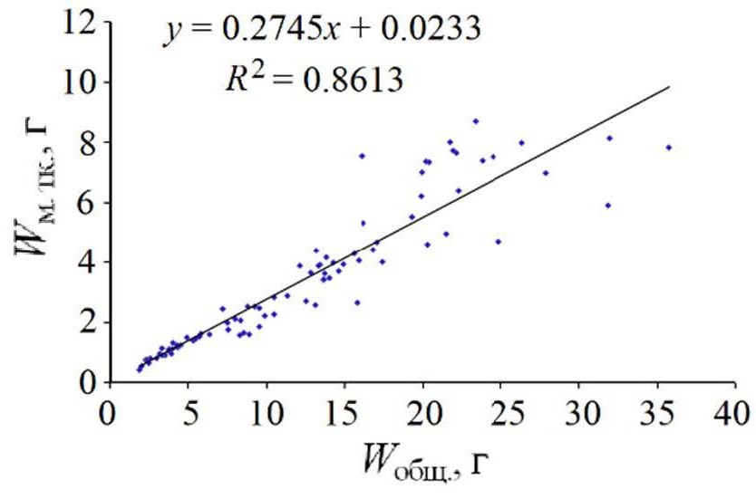 Fig. 4. Correlation of the soft tissue wet weight with the total weight of the Black Sea scallop Flexopecten glaber ponticus