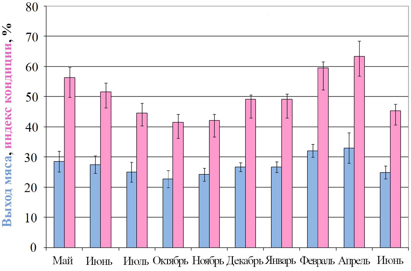 Fig. 5. Seasonal dynamics of mean values of condition index and meat yield of the scallop Flexopecten glaber ponticus during cage farming