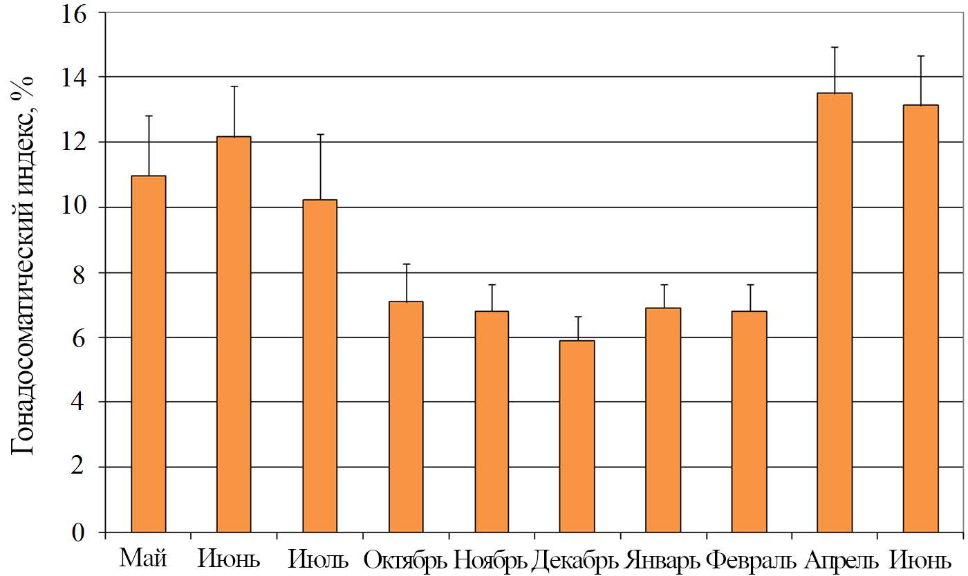 Fig. 6. Seasonal dynamics of the gonadosomatic index of the Black Sea scallop Flexopecten glaber ponticus during cage farming