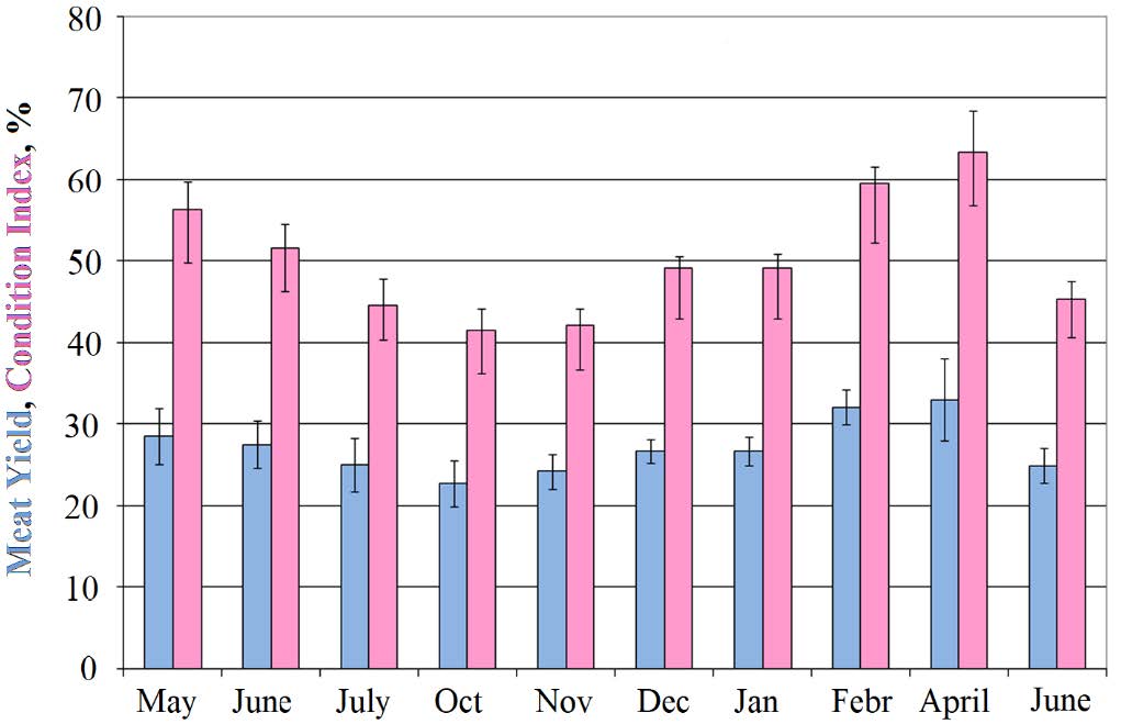 The MY, CI and GSI indices reflect the ecophysiological state of bivalves. Changing the index values adjusts significantly the cultivation biotechnology and harvesting dates. The MY values of the scallop F. glaber ponticus increased from autumn to early spring. Therefore, the commercial value of the mollusk decreases sharply during and after the spawning period when the scallop gonads are freed from reproductive bodies and the weight of the soft tissue decreases.