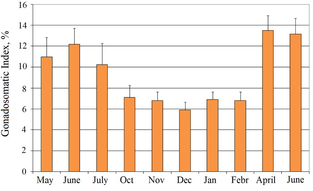 The increase in the scallop GSI values from February (6.8 ± 1.86%) to June (13.14 ± 1.52%) with its maximum in April (13.5 ± 1.44%) indicates the maturation of the gonads (Fig. 6). In parallel with the development of the gonads, the total weight of the scallop soft tissue and the CI values also increased. The Black Sea scallop spawning was noted in June – early July and the GSI value was 10.25 ± 2.0% at the end of July. From October to December, the GSI values were declining and reached their minimum in December (5.9 ± 0.74%).