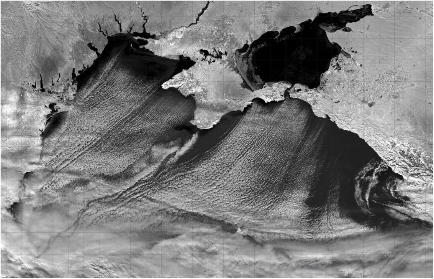 Typically, the cases of invasion of cold air masses correspond to the passage of a cold atmospheric front across the northern boundary of the sea. They are accompanied by an increase in surface wind speed up to 10–15 m/s and a decrease in air temperature down to –5...–10°С. As a result, intense convection and clouding develop in the cold boundary layer of the atmosphere above the relatively warm sea, the temperature of which in winter is in the range of 5–9 °C. A distinctive clouding pattern is observed in satellite snapshots, manifesting as cellular or roller structures [2]. Fig. 1 shows an illustrative example of such a snapshot.