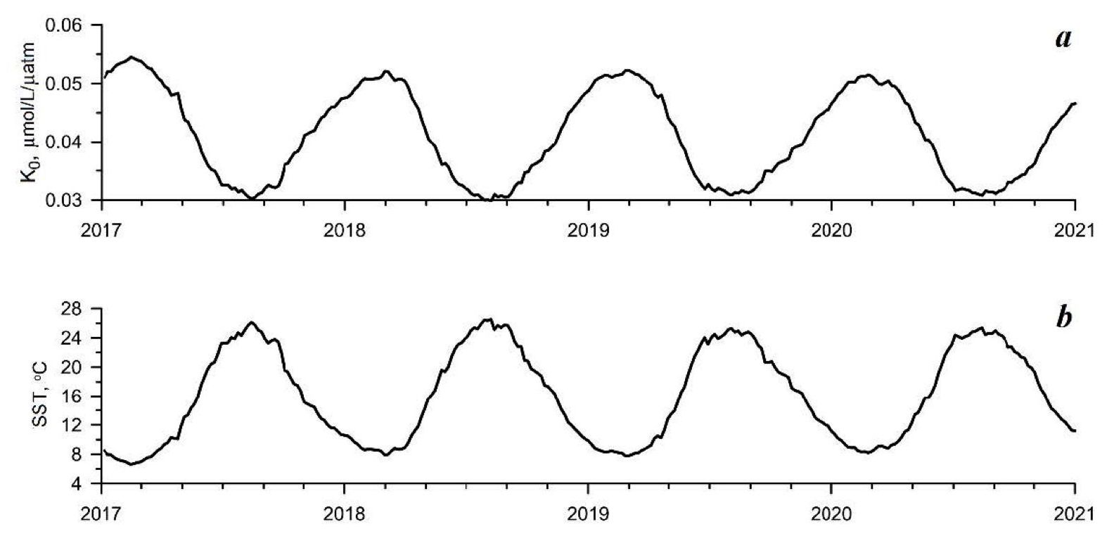 Figure 2, а shows the graph of the time dependence of the sea area averaged value of the Henry coefficient. The temperature and salinity fields obtained from the reanalysis of the Black Sea hydrodynamic fields were used to calculate the value of the coefficient at each grid point. The variability of the Henry coefficient is also highly seasonal and is almost antiphased to the change in the carbon dioxide partial pressure (see Fig. 1, b). Over the course of a year, the area average of the Henry coefficient changes by almost a factor of two. Figure 2, b shows the graph of sea surface temperature evolution. These two graphs change in antiphase and it can be concluded that the variation of the sea area averaged value of the Henry coefficient is determined mainly by the sea water temperature. That is, the main contribution to the intra-annual variability of the CO2 partial pressure in the sea surface layer is made by hydrological factors (mainly water temperature). The partial pressure decreases as the water temperature decreases and increases as the temperature increases. Accordingly, as long as the dissolved CO2 pressure is greater than the atmospheric one, the flux through the sea surface is directed towards the atmosphere which is accompanied by a decrease in the dissolved CO2 concentration. Then, when the dissolved gas pressure becomes less than the atmospheric one, the flux through the surface changes direction with an increase in the dissolved carbon dioxide concentration.