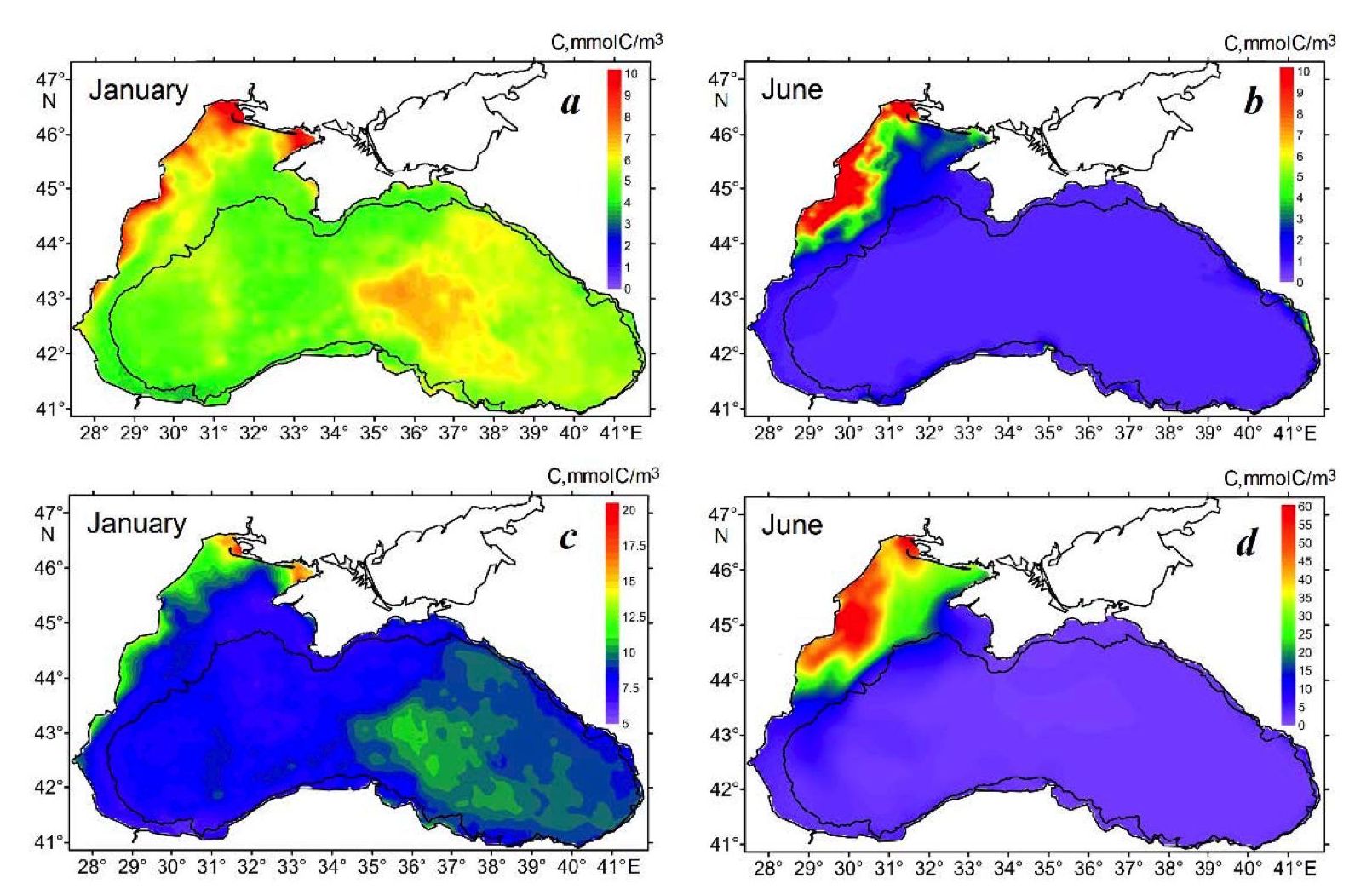 In June, concentrations of both phytoplankton and total plankton are low in the deep sea and high in the NWS (Fig. 5, b, d). Moreover, the total plankton biomass is significantly greater than the phytoplankton biomass in the NWS. Accordingly, Fig. 4, d shows that the CO2 production caused by the plankton respiration dominates in the western Black Sea, especially in the NWS.
