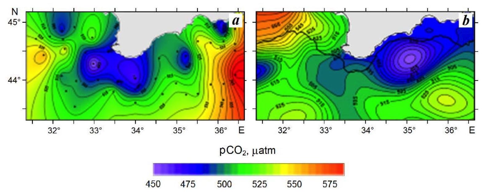 In general, the values of the CO2 equilibrium partial pressure near the sea surface obtained from the simulation results are quite close to the measurement data. The spatial distribution of pressure on two maps does not coincide, however, a characteristic decrease of pressure values near the Southern Coast of Crimea and Sevastopol is observed on both maps. It should also be noted that the map obtained from the model refers to a specific date (26 June), while the survey, on the results of which the left map is based (Fig. 6, a), lasted more than two weeks.