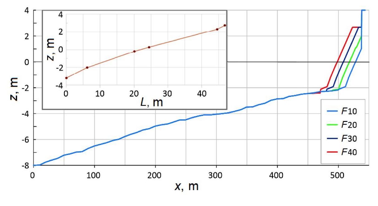 Fig. 2. Modeling profiles at the width of the designed beach F10 = 10 m, F20 = 20 m, F30 = 30 m and F40 = 40 m in the central part of the embankment in the village of Koktebel. The inset shows the estimated dynamic equilibrium profile for a mean particle size of 30 mm
