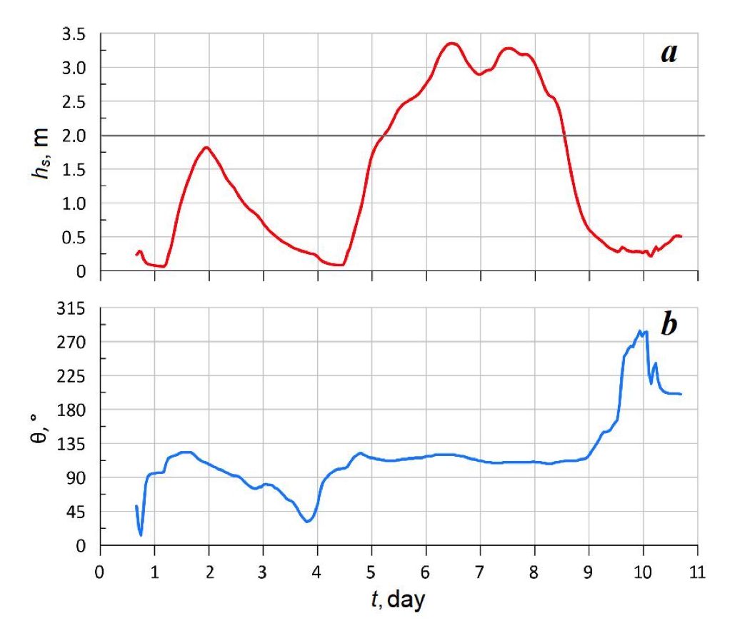 Fig.4. Significant wave heights (a) and mean wave direction (b) in the central part of Koktebel Bay for storm (S2) which is extreme by storm index (SPI = 660 m2×h, hs = 2.9 m, T = 77 h) according to SWAN-ERA data