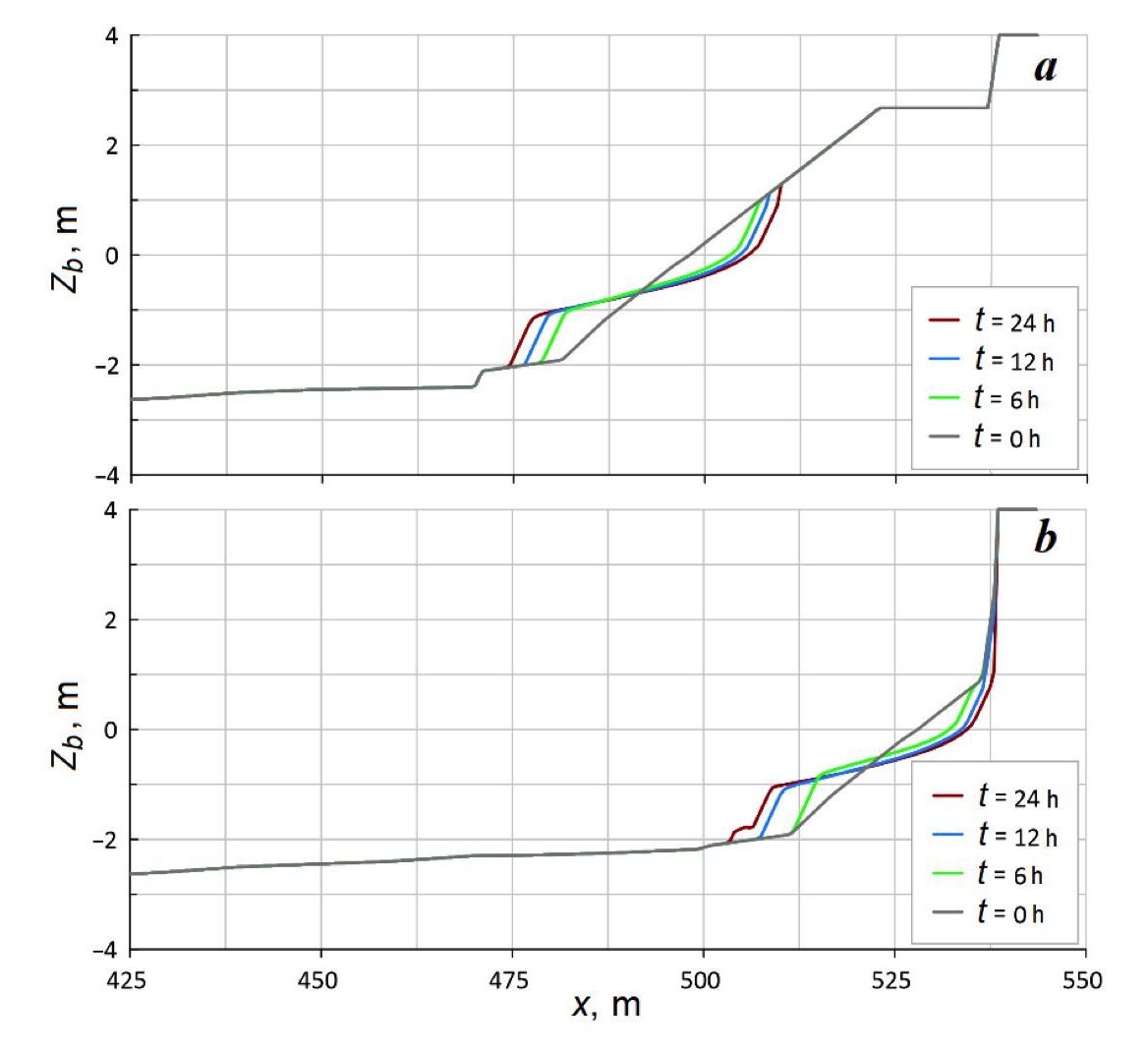 Fig. 6. Calculated beach profile F40 (a) and F10 (b) for four points of time during S1 storm