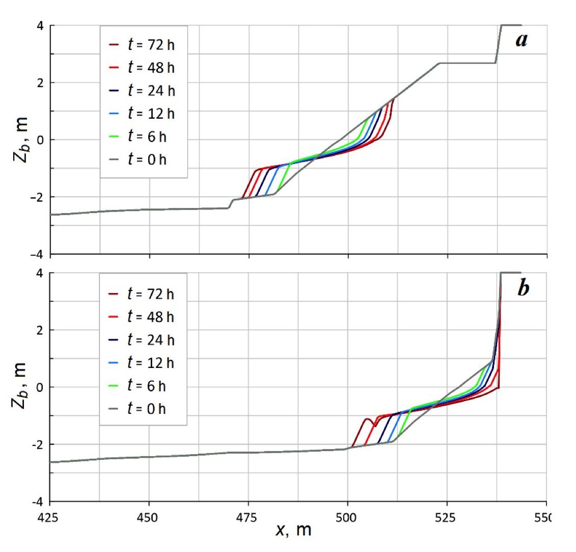 Tables 2, 3 present the results of the LC and LS parameter calculations. The data indicate that the most significant changes in LC and LS occur during the initial six hours of a storm. Therefore, the rate of shoreline retreat can reach 3.9–5.3 m even in a relatively brief storm. Following a period of storm activity lasting 24 hours, the LC values for the S1 storm were observed to range between 6.4 and 8.3 m, while those for the S2 storm ranged between 6.1 and 6.7 m. At the end of the S2 storm (t = 72 h), the LC values attained a maximum range of 9.1–10.0 m. The extent of the underwater erosion zones is three times greater than that of the erosion zones of the above-water part of the beach for all profile types.