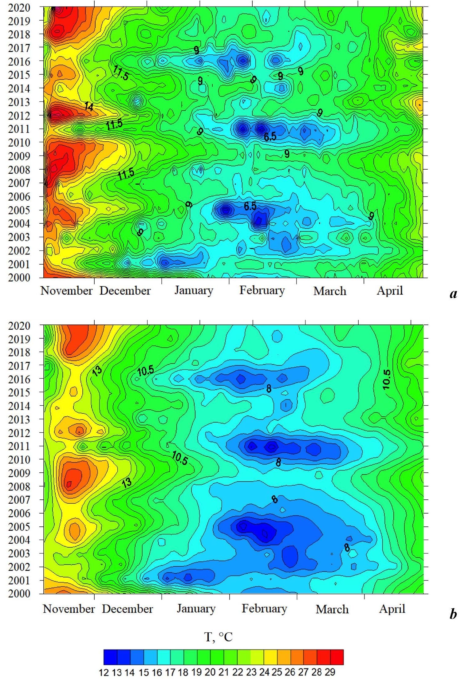 Fig. 2. Time variations of water temperature in Martynova Bay during the cold half of the year for 2000–2020: daily (a), average ten-day (b)