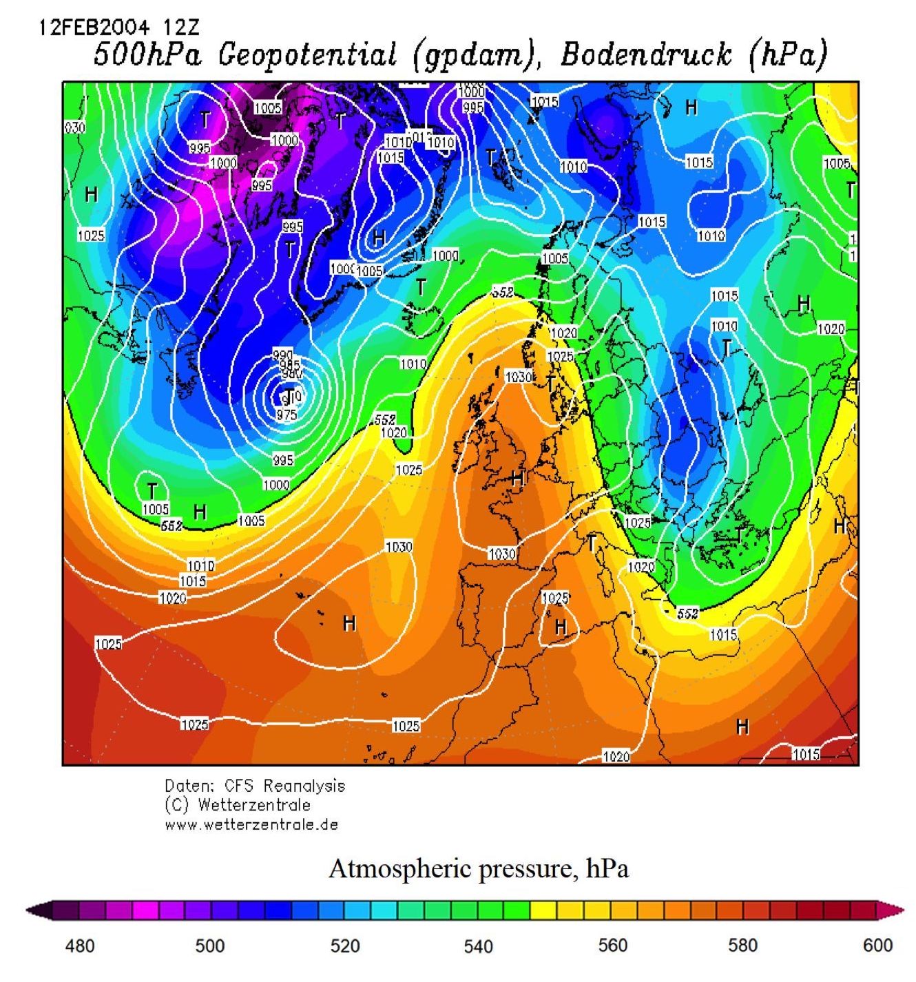 Fig. 5. Synoptic situation during the polar invasion of the Black Sea, map on 12 February 2004, 12:00 GMT