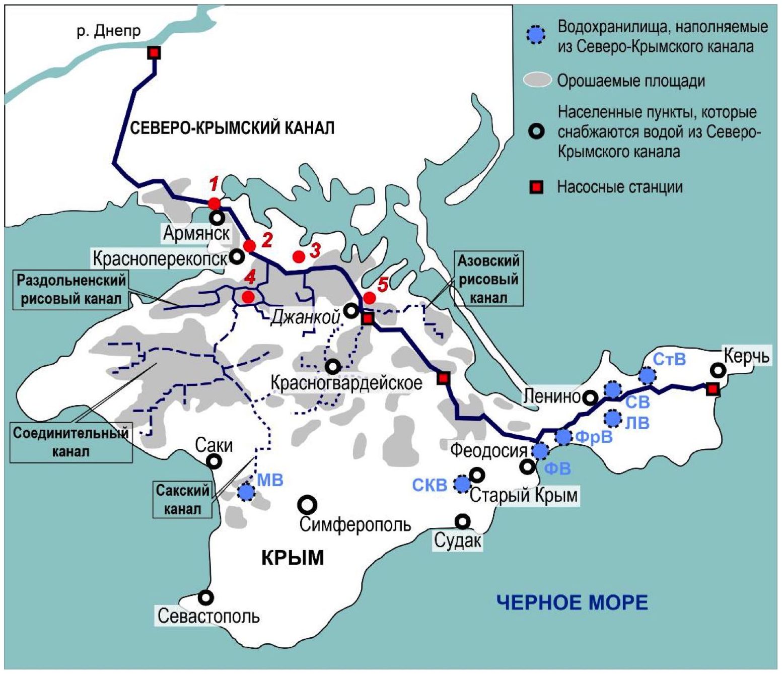 Fig. 1. Scheme map of sampling in the area of the North Crimean Canal (2022–2023). Arrows indicate sampling stations: 1 – main bed of the NCC, Armyansk area; 2 – main bed of the NCC, Krasnoperekopsk area; 3 – the village of Krepkoe, Krasnoperekopsk area; 4 – branch of the NCC, the village of Ilyinka, Krasnoperekopsk area; 5 – the village of Pobednoye, Dzhankoy area). Water reservoirs: МВ – Mezhgornoe, СКВ – Starokrymskoe, ФВ – Feodosiyskoe, ФрВ – Frontovoe, ЛВ – Leninskoe, СВ – Samarlinskoe, СтВ – Stantsionnoe (Kerchenskoe)