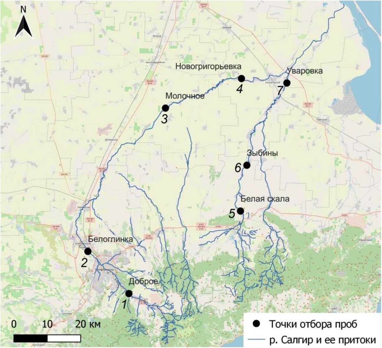To assess the hydrochemical state of waters of the Salgir River and its most full-flowing tributary, the Biyuk-Karasu River, studies were carried out in July, August and September 2023 in four sections of the Salgir River from its head to its mouth and in three sections of the Biyuk-Karasu River along the main stream to the mouth (Figure).