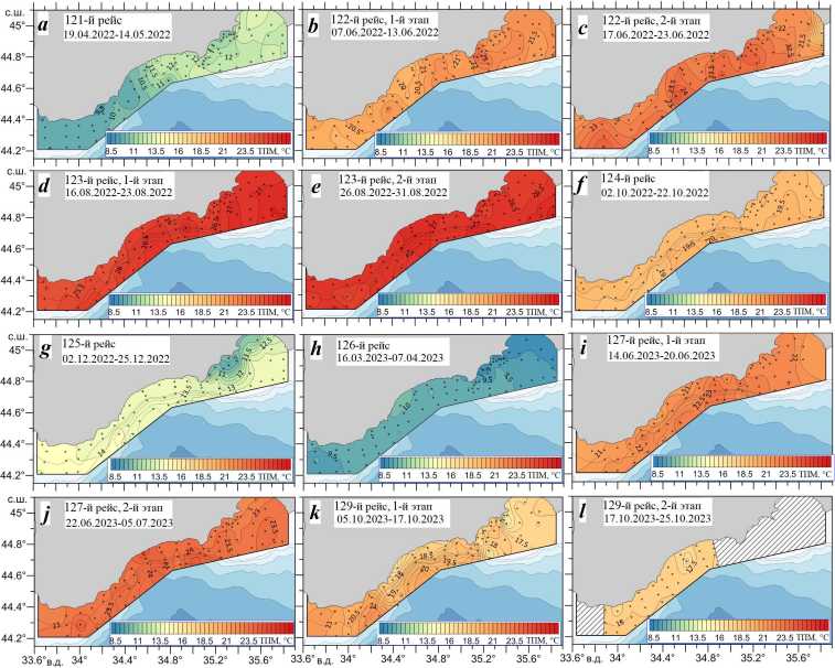 Against the background of clearly pronounced seasonal changes during each separate survey, the SST distribution in the polygon water area exhibited notable spatial heterogeneity. The minimum ranges of the SST spatial changes at the polygon not exceeding 1.5–2 °С were observed at the end of August 2022 (2nd stage of the 123rd cruise) (Fig. 2, e) and in the second half of March and early April 2023 (126th cruise) (Fig. 2, h), when the warmest and coldest surface waters, respectively, were observed over the entire water area. The maximum SST spatial changes reaching 4–4.5 °C were observed at the polygon in April – May (121st cruise) and December (125th cruise) 2022 and in the first half of October 2023 (1st stage of the 129th cruise), when intensive heating and cooling of surface waters occurred (Fig. 2, a, g, k).