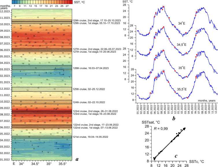Fig. 3. Distributions of SST daily averaged values based on satellite data from 1 January 2022 to 31 December 2023 along the 50 m isobath (a), satellite SST daily averaged values on separate meridians (blue curves) and in situ SST values at these meridians on the same day (red dots) (b), a graph of the linear relationship between the satellite (SSTsat) and in situ (SSTis) temperature series (c). The periods of surveys are highlighted by black rectangles in fragment a, the dashed lines in fragment c – 99% confidence interval boundaries