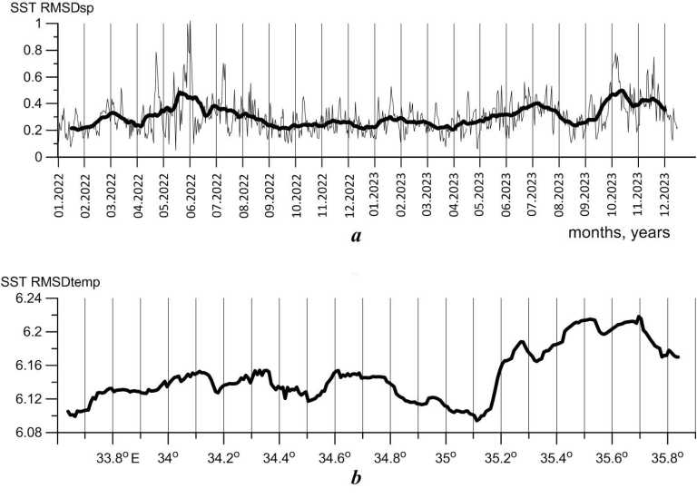 Fig. 4. Distributions of daily averaged values of spatial SST RMSD (heavy curve – smoothing by a 31-day moving average) (a) and values of temporal SST RMSD for the period from 1 January 2022 to 31 December 2023 (b) along the 50 m isobath within the measurement polygon based on the satellite data
