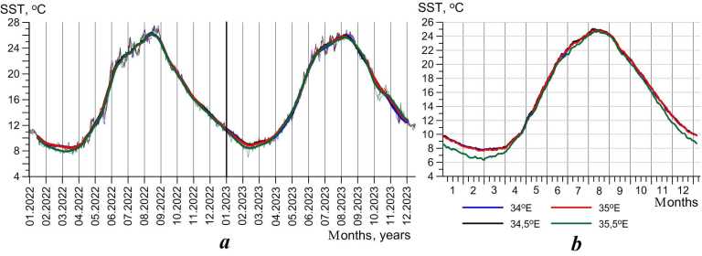 Fig. 6. Distribution of SST daily averaged values for the period from 1 January 2022 to 31 December 2023 (a) and its daily averaged climate values from 1 January to 31 December (b) at different meridians at grid nodes located above the 50 m isobath according to the satellite data. Heavy curves on fragment a are smoothed by a 31-day moving average