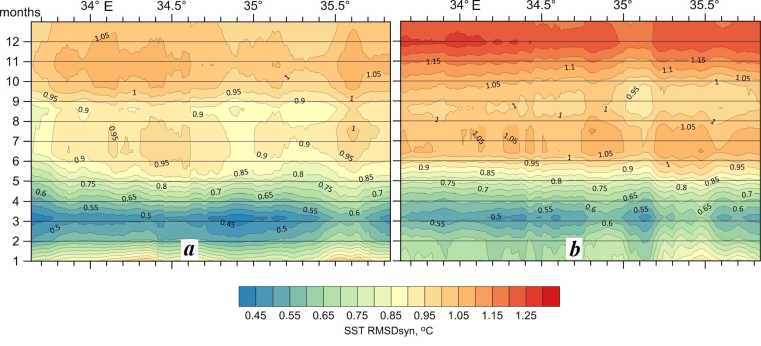Fig. 7. Intra-annual variation of the SST RMSDsyn values based on the satellite data in 2022 (a) and 2023 (b) along the 50 m isobath within the survey area