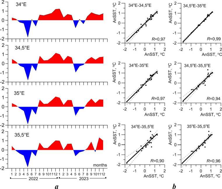 Fig. 8. Distribution of AnSST from January 2022 to December 2023 at separate grid nodes above the 50 m isobath (a), graphs of the linear relationship between AnSST series on different meridians (the dashed lines – 99 % confidence interval boundaries) (b)