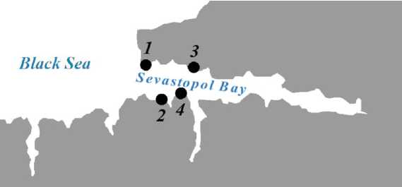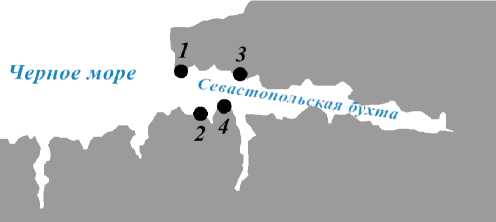 Fig. 1. Schematic map of the location of hydrobotanical profiles in the western part of Sevastopol Bay (1 – Cape Konstantinovsky; 2 – Cape Khrustalny; 3 – Cape Slavy; 4 – Monument to Sunken Ships)