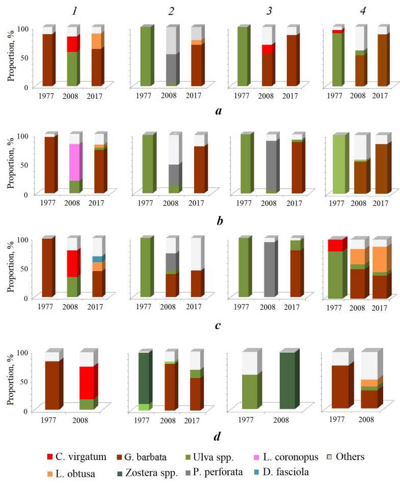 The results of studies conducted in 2017 indicate that the western part of Sevastopol Bay is characterised by a decrease in the quantitative indicators of macrophytobenthos in the lower sublittoral zone. This trend is observed in other areas of the Black Sea coastline that have experienced an increase in eutrophication [19, 20]. The aforementioned trend precipitates a series of catastrophic outcomes in the bays. Thus, in the area of Cape Konstantinovsky (profile 1), at a depth of 5 m, the total macrophyte biomass decreased 20-fold and the proportion of Gongolaria barbata decreased 5-fold from 1977 to 2017 (Table 2). During the same period, the total biomass of macrophytes at the same depth exhibited a decrease of over two orders of magnitude in the area of Cape Slavy (profile 3). The remaining study areas also showed a decrease in the contribution of Gongolaria barbata from 2008 to 2017.