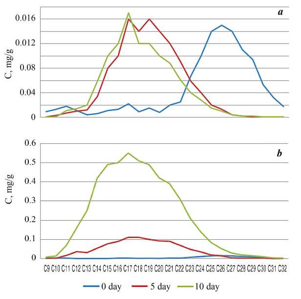 Initially, the algal sample (control, day 0) contained 0.540 mg/g PP, of which С9–С30 n-alkanes were 0.1 mg/g. The sample was characterised by an increased content of petroleum IH in a range of C23–С30 (Fig. 2). It is important to note the absence of any expressed endogenous n-alkanes in ulva compared to algae living in polluted water areas [15, 16]. On the 5th day of the experiment without DF addition (control, day 5), gross IH content in ulva tissues decreased to 0.49 mg/g, on the 10th day – to 0.34 mg/g. The amount of n-alkanes in algal tissues also decreased fourfold, from 0.1 µg/g (day 0) to 0.026 mg/g (day 10). The value of the marker indicator ∑n-alkanes/∑PP also underwent a significant decrease from 0.19 (on the first day) to 0.08 (on days 5 and 10), indicating active IH transformation during the initial five days. The value of this indicator at the level of less than 0.1 is characteristic of algae growing in relatively clean water areas. The process of petroleum IH absorption by the surface of the algae is initiated upon the DF addition. In the experiment with the addition of DF at a concentration of 10 mg/L, the PP content in ulva tissues on the 5th and 10th days was recorded at 0.6 mg/g (Fig. 2, а). The marker ratio of ∑n-alkanes/∑PP was established at 0.2 during the course of the experiment. A slight decrease in this index to 0.18 on the 10th day signifies the onset of a transformation in the chemical structure of hydrocarbons. In the ulva sample where DF was added in the amount of 20 mg/L, this index on the 5th and 10th day was recorded at 0.25 and 0.28, respectively, indicating an active process of hydrocarbon absorption which was not yet completed on the 10th day. The maximum PP content in the algae was recorded on the 10th day of the experiment when 20 mg/L was added, and was found to be 18 mg/g (Fig. 2, b).