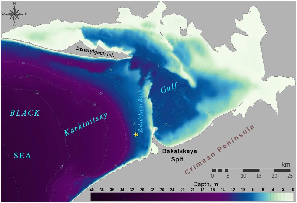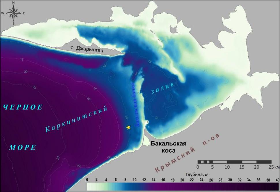 Fig. 1. Schematic map of the Karkinitsky Gulf in the Black Sea (data on underwater topography are given using SonarChart™ materials) (available at https://webapp.navionics.com). The star denotes the point for which the main wave parameters were calculated