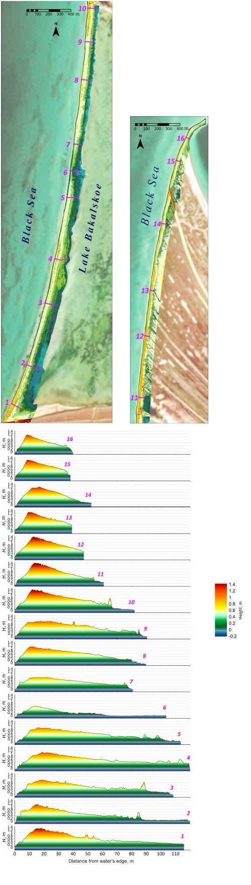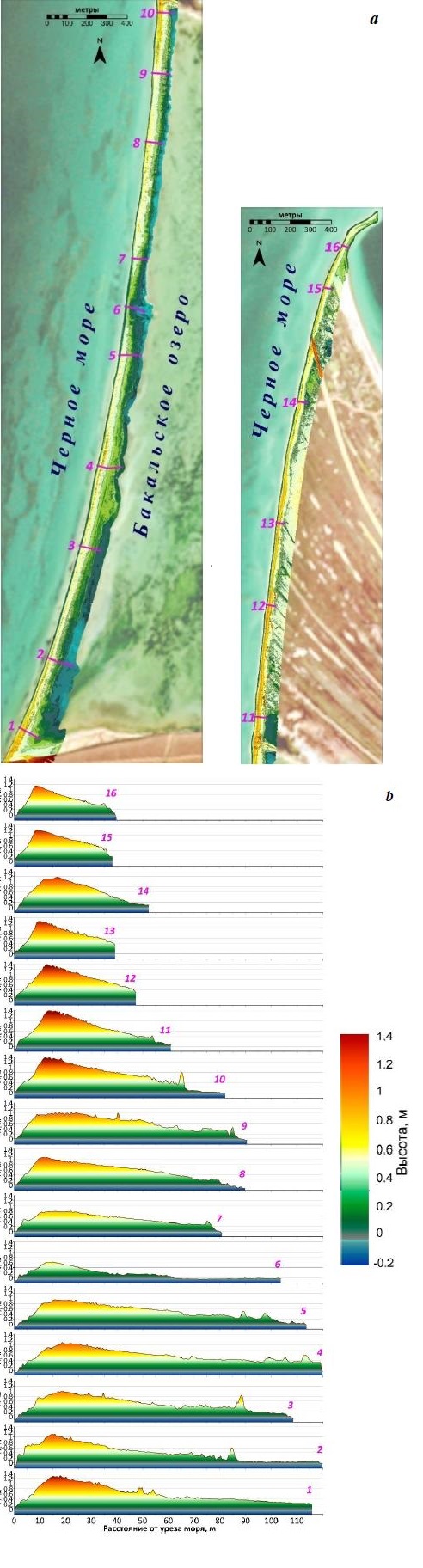 Fig. 2. The relief of the Bakalskaya Spit western branch (a), transverse profiles (b): left – barrier beach of Bakalskoe Lake, right – main part of the spit. The numerals indicate the numbers of the profiles