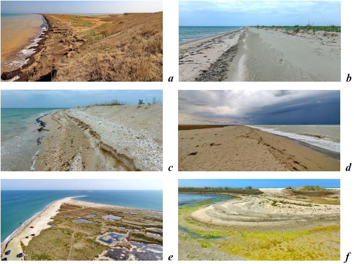 Fig. 3. The western branch of the Bakalskaya Spit: a – the root part; b – the barrier beach of Bakalskoe Lake; c – a cape formed at the sea water’s edge as a result of the exposure of vegetation remnants of the inner part of the spit; d – the beach in the central part of the spit; e – the distal part of the spit; f – the overflow cone on the shore of Bakalskoe Lake