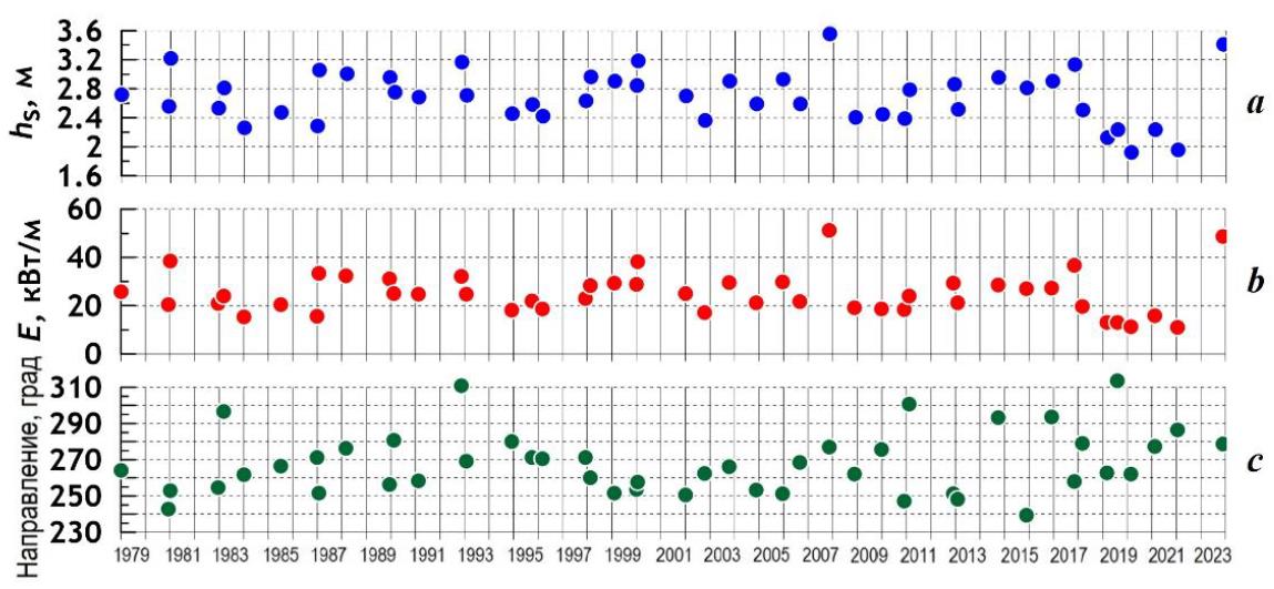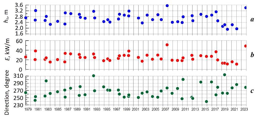 Fig. 4. Parameters of the largest storms west of the Bakalskaya Spit: a – maximum significant wave heights; b – maximum wave power; c – general directions of storms