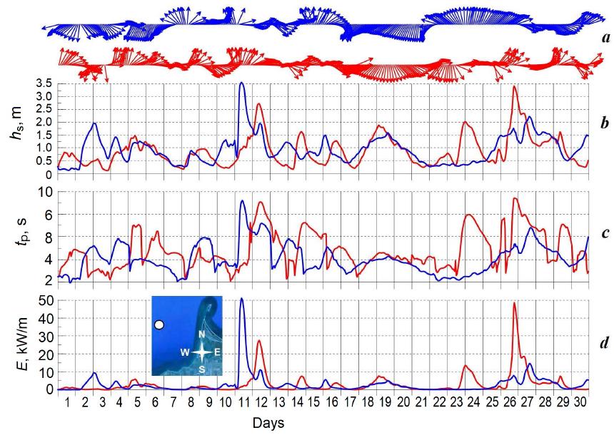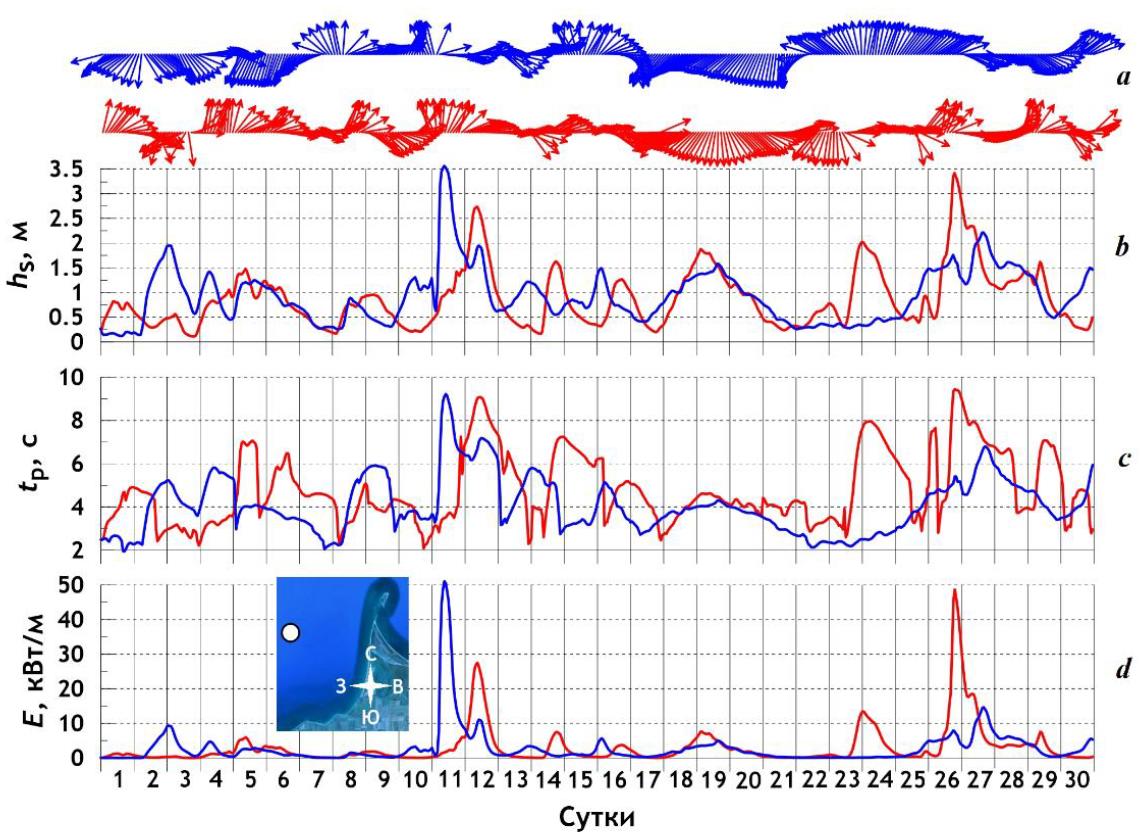 Fig. 5. The main parameters of wind waves for the water area west of the Bakalskaya Spit in November 2007 (blue) and 2023 (red): a – propagation directions; b – significant wave heights; c – peak and mean wave periods; d – wave power