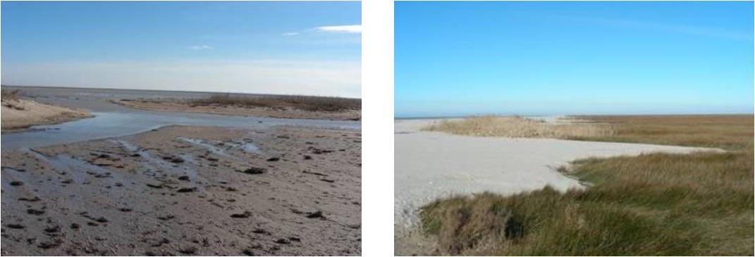 Fig. 6. Transformation of the western branch of the Bakalskaya Spit during the storm: left – a washout in the barrier beach of Bakalskoe Lake; right – movement of sand from the seashore to the inner part of the spit