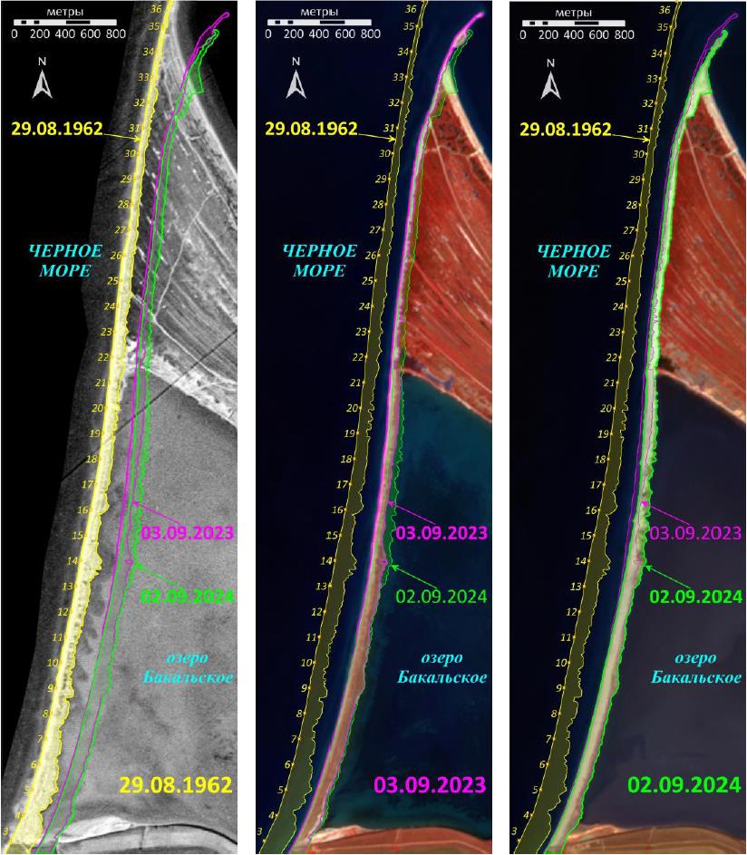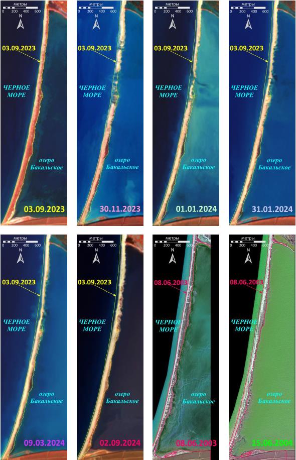 Fig. 9. Transformation of the barrier beach of Lake Bakalskoe after the storm on 26–27 November 2023. For comparison, illustrations of the transformation of the barrier beach in 2003–2004 are given