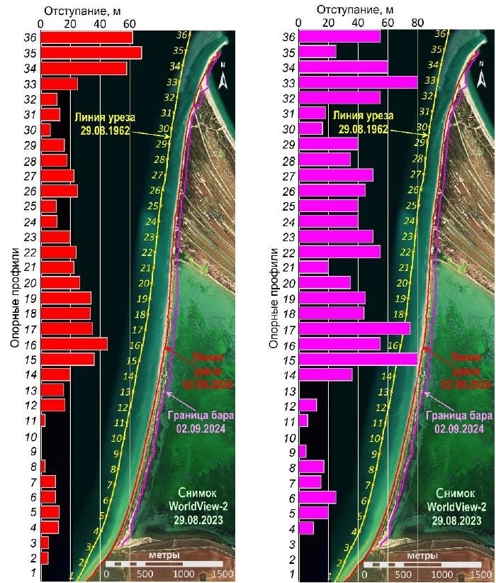 Fig. 8. Retreat of the sea water’s edge (left) and the rear part of the beach bar (right) of the western branch of the Bakalskaya Spit during the storm on November 26–27, 2023. The numbers indicate the numbers of the support profiles, the distance between the profiles is 200 m
