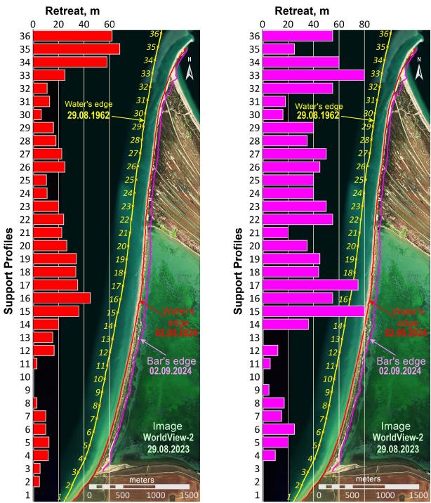 Figs. 7 and 8, а demonstrate the western branch sea’s edge retreat values from 03.09.2023 (pre-storm) to 02.09.2024 (post-storm and restoration of bar integrity). It can be seen that the amount of retreat varies considerably along the entire spit. In the section of the main shore south of the spit, the retreat is either absent (RP 1) or does not exceed 5 m (RP 2 – RP 3). At the root part of the spit, the edge retreat is relatively small (10–12 m), and at the RP 8 – RP 11 section it does not exceed 5 m. In the northern part of the Lake Bakalskoe barrier beach (RP 12 – RP 22), the retreat values increase significantly, averaging 28 m and reaching 45 m at RP 16. In the section where the western branch is a bar extending over the inner part of the spit (RP 23 – RP 33), the retreat is slightly less, averaging 16.2 m. Within the distal end (RP 34 – RP 36), the western shore retreated approximately 60 m.