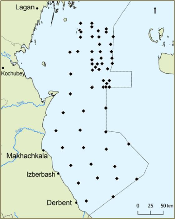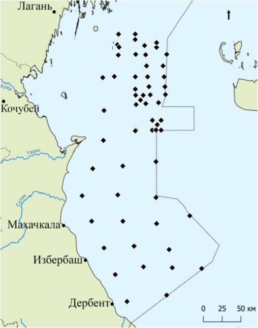 Работа написана по результатам производственного экологического мониторинга, проведенного на лицензионных участках ООО «ЛУКОЙЛ-Нижне-волжскнефть» в 2017–2021 гг. Мониторинг проводился два раза в год (весенне-летний и осенний периоды). Пробы отбирали последовательно на 58 станциях (рис. 1) в поверхностном и придонном слоях.