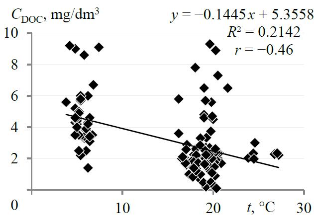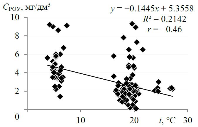 Fig. 4. Dependence of dissolved organic carbon СРОУ (mg/dm3) on water temperature (°C) in the surface water layer during spring
