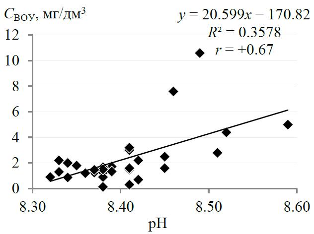 Летом выявлена корреляционная зависимость концентрации РОУ и ВОУ от рН воды. Зависимость ВОУ от рН (r = 0.67 и 0.62 соответственно для поверхностного (рис. 6) и придонного слоя), была сильнее, чем зависимость РОУ от рН (r=0.48 и 0.57 соответственно для поверхностного и придонного слоя). Для всех вышеперечисленных зависимостей n=74; α=0.05.