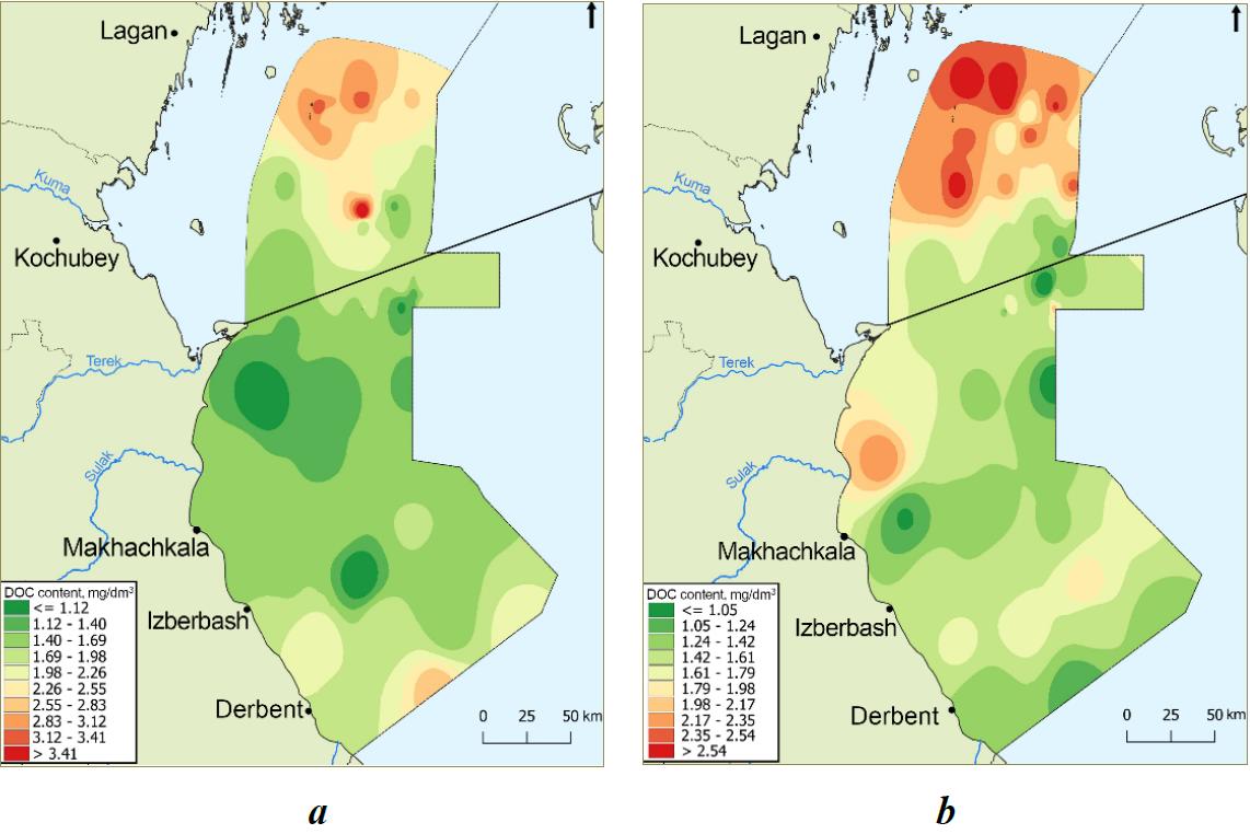 Концентрация РОУ и ВОУ в поверхностном слое воды российского сектора Каспийского моря выше, чем в придонном, что обусловлено первичным продуцированием ОВ в фотическом слое и разложением ОВ в толще воды. Сезонная динамика характеризуется снижением РОУ и ВОУ от весны к осени, что объясняется естественными гидролого-гидрохимическими причинами (повышенной инсоляцией в летне-осенний период, ингибирующей процесс фотосинтеза, началом развития деструкционных процессов в осенний период, снижением поступления аллохтонного ОВ со стоком р. Волги).