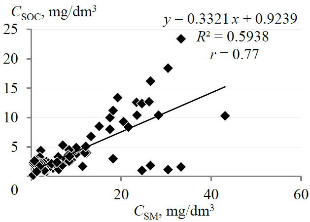 Fig. 5. Dependence of suspended organic carbon concentration СВОУ (mg/dm3) on suspended matter concentration СВВ (mg/dm3) in the surface water layer during spring