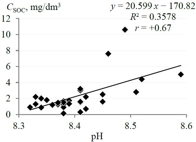 Fig. 6. Dependence of suspended organic carbon concentration СВОУ (mg/dm3) on рН in the surface water layer during summer