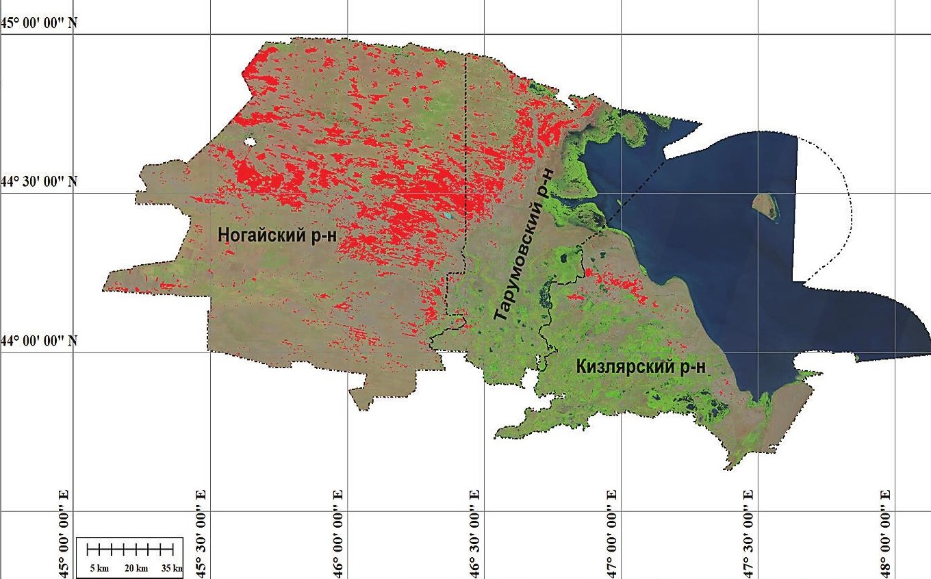 Дистанционное зондирование дает возможность организовать мониторинг состояния пастбищ на значительной площади, при этом обеспечивается уменьшение объема наземных исследований, экономическая эффективность и научная достоверность исследований [1]. На основании картографо-аэрокосмического мониторинга пастбищ и компьютерной обработки космоснимков региона исследования (представлены ФНЦ агроэкологии РАН) составлены геоинформационные слои: обзорная космокарта Кизлярских пастбищ; космокарты и тематические карты уровней деградации пастбищ по административным районам, отнесенным к региону исследования [4]. Распространение процессов опустынивания на территории Республики Дагестан связано как с увеличением площадей открытых песков в результате песчаных и пыльных бурь, так и с большим количеством засоленных участков в Ногайском, Тарумовском и Кизлярском районах (рис. 1).