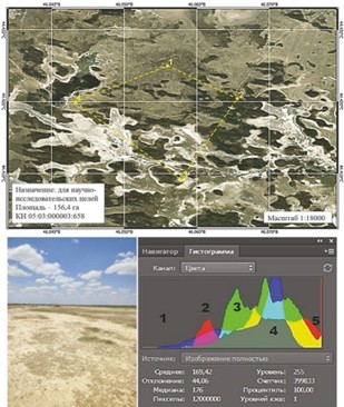 Рисунок 2. Карта тестового участка «Ногайский 1» (полигон Ногайский район, Дагестан); фотоэталон; гистограмма распределения пикселей на фотоэталоне в режиме «Цвета»: 1 – диапазон фототона растительности; 2 – диапазон фототона неба; 3 – диапазон фототона песчаного массива; 4 – диапазон фототона тени