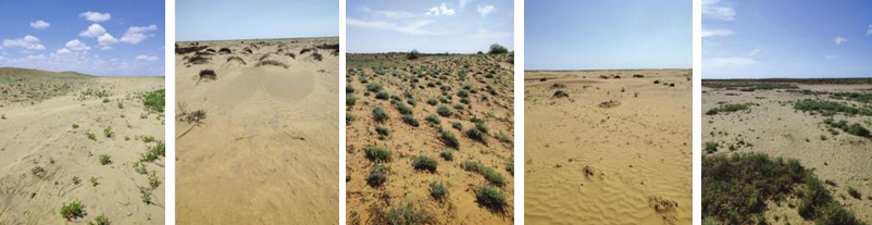Площадь опустыненных земель (как занятыми песками, так и засоленных) составляет 170 тыс. га. Исследования показали, что полученные данные по проективному покрытию растительности на участке №1 составили 35 %, доминантное растение – верблюжья колючка и степени деградации – дефляция; на участке №4 – полынь таврическая и высокая (по 42 %), засоление.