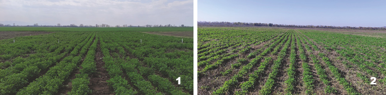 Рисунок 1. Опытные посевы люцерны с нормой высева 1,0 млн шт/га и междурядьями 45 см (1 – апрель, 2 – октябрь)