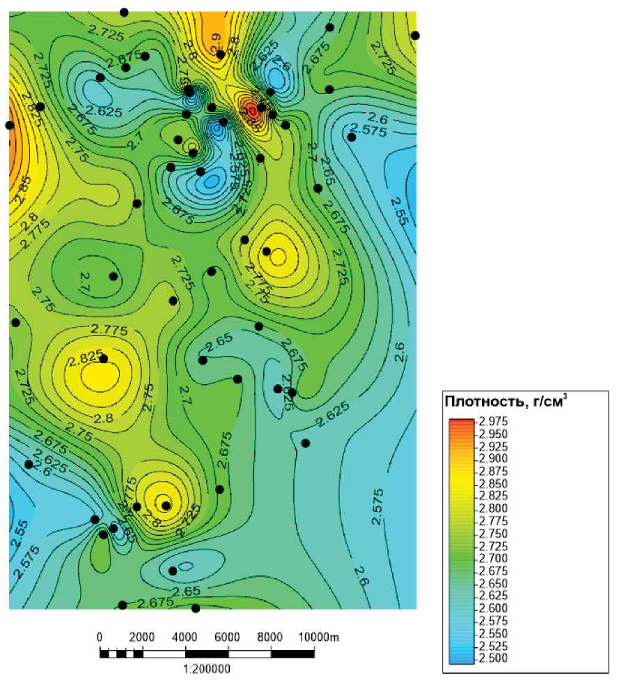 Количество скважин, безусловно, влияет на детализацию карты в разных частях. В юго-восточной части скважин мало, поэтому распределение плотности в этой части характеризуется менее резкими изменениями. При перемещении в западном направлении количество скважин увеличивается и становится возможным выделить две области повышенных значений плотности с величинами около 2,8 и 2,825 г/см3. Наибольшая разница в значениях плотности наблюдается в северной части месторождения с дифференциацией по значениям от 2,5 до 2,9 г/см3. Если рассматривать причины появления таких диапазонов значений, то можно выделить седиментационные и тектонические. Также могут проявляться вторичные процессы изменения литологического состава коллекторов и их коллекторских свойств. Сформированное поле (карта изолиний) даёт представление о распределении наиболее уплотнённых областей с пониженными значениями пористости.