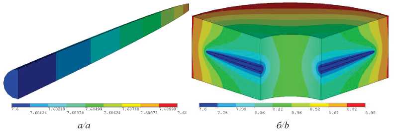 Рис. 2. Распределение давления (МПа) в перфорационном канале (а) и в окружающей породе-коллекторе (б) при депрессии 10 МПа