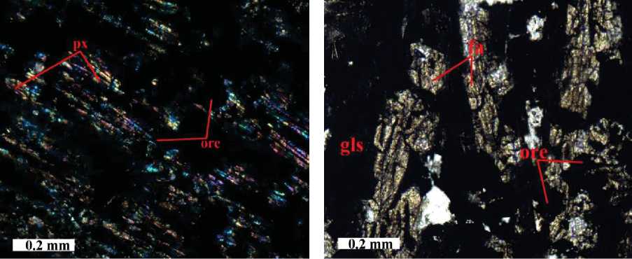 Рис. 1. Микрофотография медных шлаков в проходящем свете, николи скрещены. px – ферросиллит, fa – фаялит, gls – стекло, ore – рудные минералы